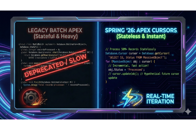 Apex Cursors (GA): Por fin alcanzan su madurez (General Availability). Si sigues usando Database.Batchable para todo, es hora de evolucionar.