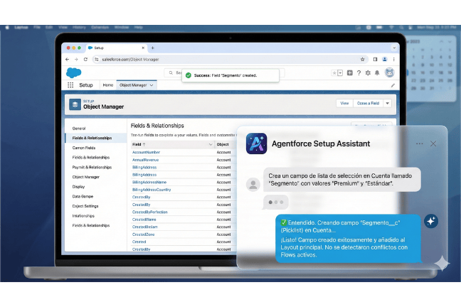 El sistema no solo lo ejecuta, sino que analiza las dependencias antes de actuar, avisándote si ese cambio rompería un Flow o una regla de validación. Es el fin de la deuda técnica accidental.